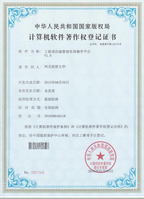 近日,由公司与经济管理实验中心、教务处联合自行开发的实训教学平台:《工程项目级管理实训教学平台V1.0》获得由国家版权局颁发的计算机软件著作权登记证书(证书编号:2016SR048118)。