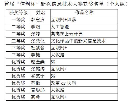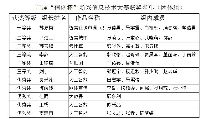 正在全球进行的新一轮信息技术革命,正以前所未有的方式对人类社会的发展产生重大影响。为更好地促进员工熟悉当前新兴信息技术的发展现状,给有创新意识和设计技能的员工提供一个展示平台。公司自2017年10月份开始以来,历时将近两个月的时间举办了首届“信创杯”新兴信息技术作品大赛,大赛涵盖物联网、云计算、大数据和人工智能等多个主题,得到员工的热烈欢迎,共收到参赛作品123份,其中个人组作品82份,团队组作品41份。经过微信投票、现场投票和评委打分后各评出个人组和团体组的获奖作品一等奖1项,二等奖2项,三等奖3项,优秀奖6项,其中获奖名单人如下。