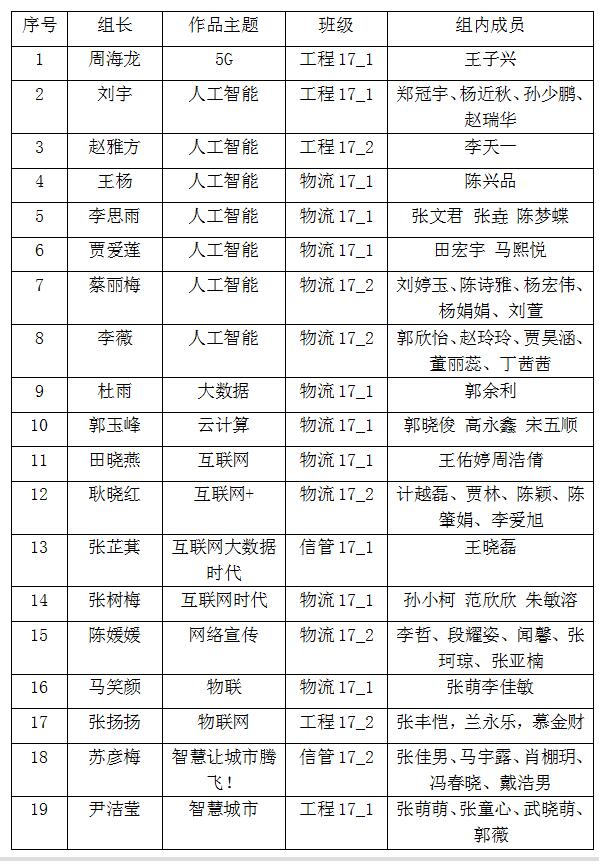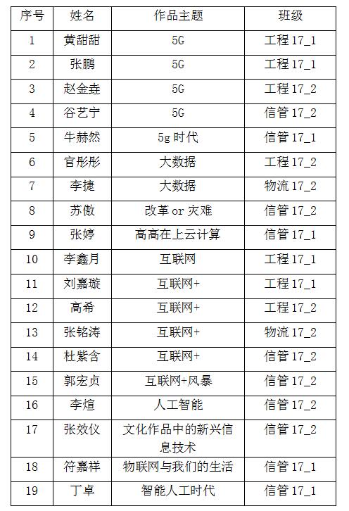 大赛主要包括互联网,物联网,云计算,大数据,人工智能,互联网+,移动互联网,5G,智联网和智慧城市等多个与新兴信息技术相关的主题,本次活动得到公司2017届工程管理、物流管理和信息管理与信息系统三个专业新生的热烈欢迎,自2017年10月底开始报名后,共收到参赛作品123份,其中个人组作品82份,团队组作品41份,经员工评审团的初步筛选,分别从个人组和团体组筛选出19份参赛作品参加第二阶段的决赛,其中进入决赛阶段的名单附后。