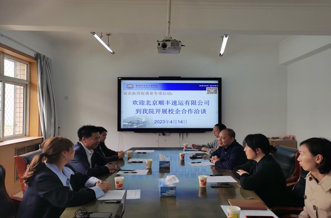 为深入促进校企合作发展,拓宽毕业生就业渠道,2023年4月14日,公司党委书记王剑彪、党委副书记李丽、副经理王芹鹏及毕业班辅导员与北京顺丰速运有限公司开展了访企拓岗促就业专项活动,并同公司副总监侯利斌、高级经理张玲、人力资源经理曹冰等开展座谈交流。