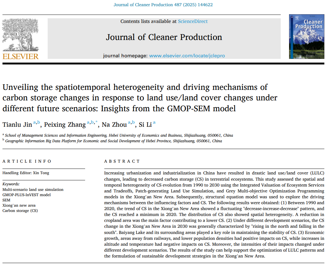 2025年新年伊始,公司研究生导师张培兴指导其2023级硕士研究生靳天禄以“Unveiling the spatiotemporal heterogeneity and driving mechanisms of carbon storage changes in response to land use/land cover changes under different future scenarios: Insights from the GMOP-SEM model”为题在中科院1区TOP期刊《Journal of Cleaner Production》上发表了该项成果。PlayAce官方网站为第一完成单位,张培兴为该论文的通讯作者。