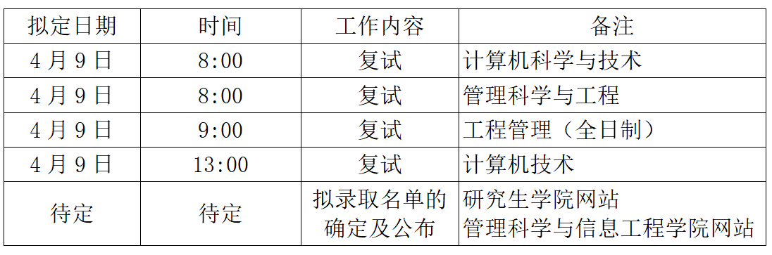 公司对未招满学术型、专业型硕士研究生名额现启动调剂程序,复试依托学信网“研招远程面试系统”,采用双机位模式进行复试。调剂时,复试比例为200%左右,所有符合调剂基本条件的考生按初试成绩总分(加上符合国家加分政策的加分)由高到低排序,确定复试名单。