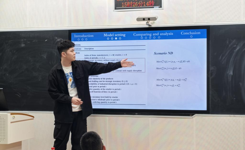 9月23日,公司在三教215教室开展管信研究生学术沙龙第一期活动。本期活动由2023级研究生赵启轩和2022级研究生张玉潭围绕 “中断供应链战略库存与闭环供应链回收”主题进行学术分享,副经理王芹鹏主持,导师张雪峰、张少卿、学科秘书曹洋及全体物流方向研究生、本科生共30余人参加。