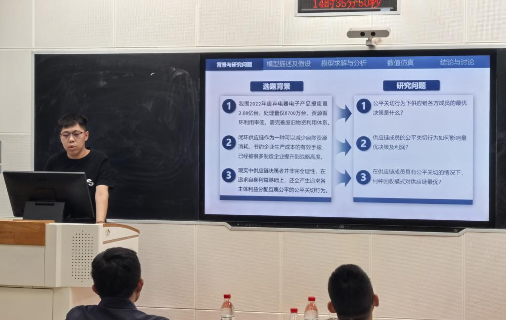 沙龙活动上,赵启轩分享了论文“Research on Recycling Channel Decisions in Dual-Channel Closed-Loop Supply Chains Considering Fairness Concerns”,详细介绍了该论文的研究背景、模型分析、数值仿真与结论。张玉潭分享了论文“Strategic inventory in semi-conductor supply chains under industrial disruption”,深入探讨了战略库存在减缓半导体供应链中断影响中起到的作用等问题,详细介绍了该论文的数据和模型建立,创新思路与解决方案。张雪峰、张少卿就两篇论文提出修改建议,并围绕本期主题的研究热点和重点对研究生进行了专业的指导。