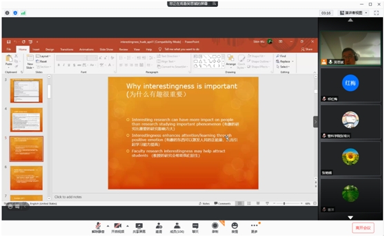 吴思斌教授首先从学术研究角度引出为什么要追求有趣性,以及有趣性所需要具备的特点和要求。其次,吴教授详细讲解了如何借助优秀的写作能力,将有趣的思想融合到自己的文章中去的程序和步骤。最后,吴教授通过实例阐述能使文章的有趣性增强的八种方法和维度扩展、深挖概念、比较不同环境的写作技巧。此次学术报告视角新颖、内容丰富,拓宽了与会教师和同学的学术视野,使大家对学术期刊的评审标准有了更加深入的认识。