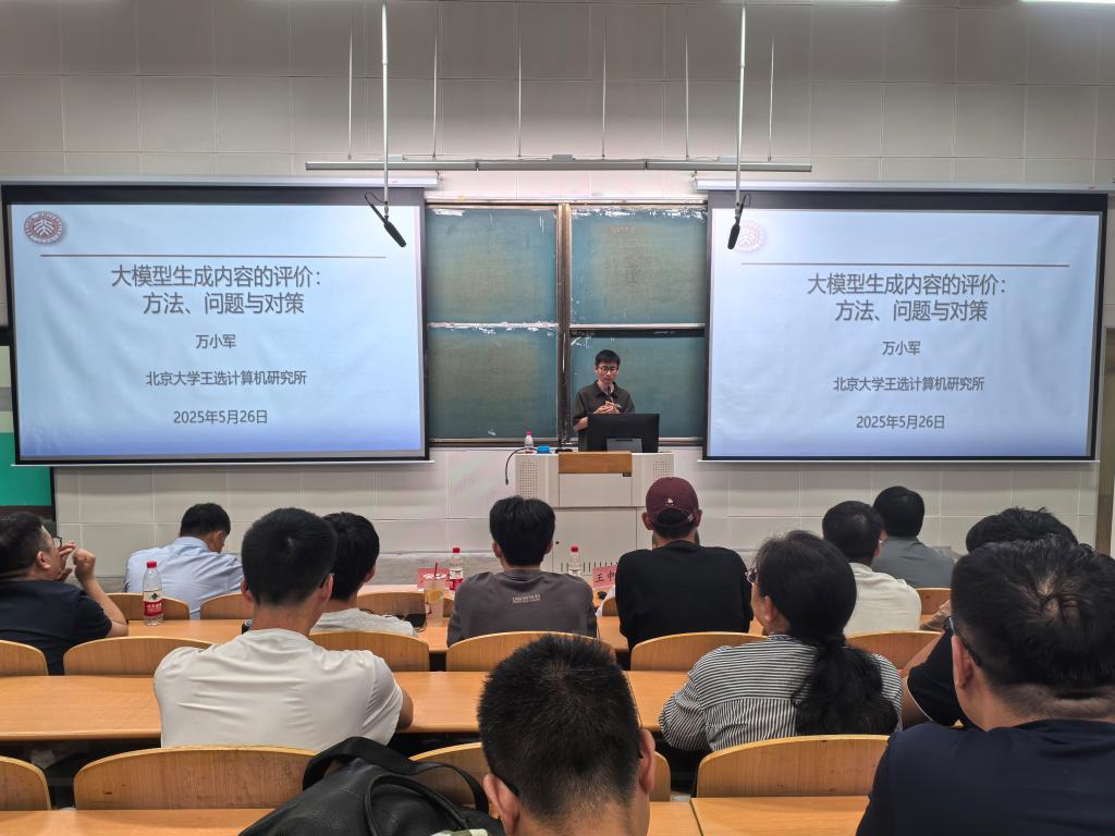 随后,万小军介绍了CCF-NLP及专委会主要研究方向,并作了题为《模型生成内容的评估:方法、问题与对策》的报告,介绍了大模型生成文本的主要方法,剖析了人工评价、自动评价以及评测数据三方面面临的问题和挑战,同时讲解了应对上述问题的可能对策。最后,万小军介绍了团队在该方向的研究进展。