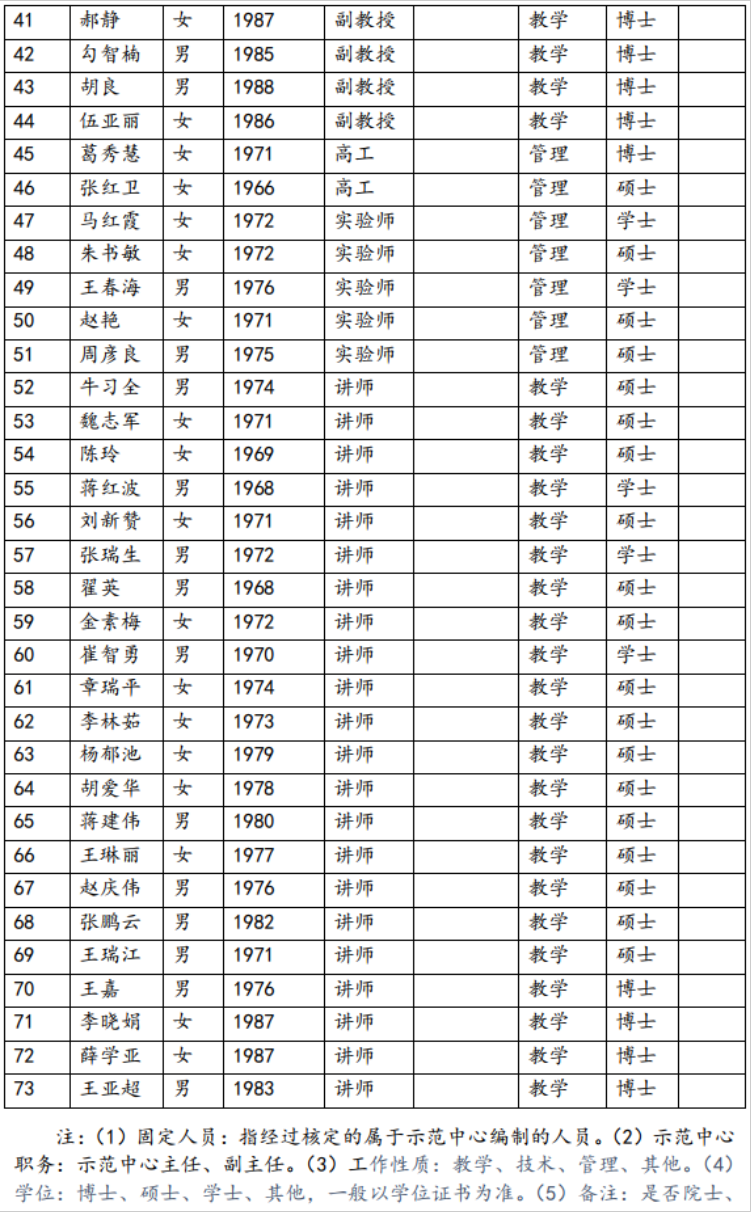 截止目前,示范中心共有教师73名,其中高级职称45名,占比61%。博士27名,占比37% 。