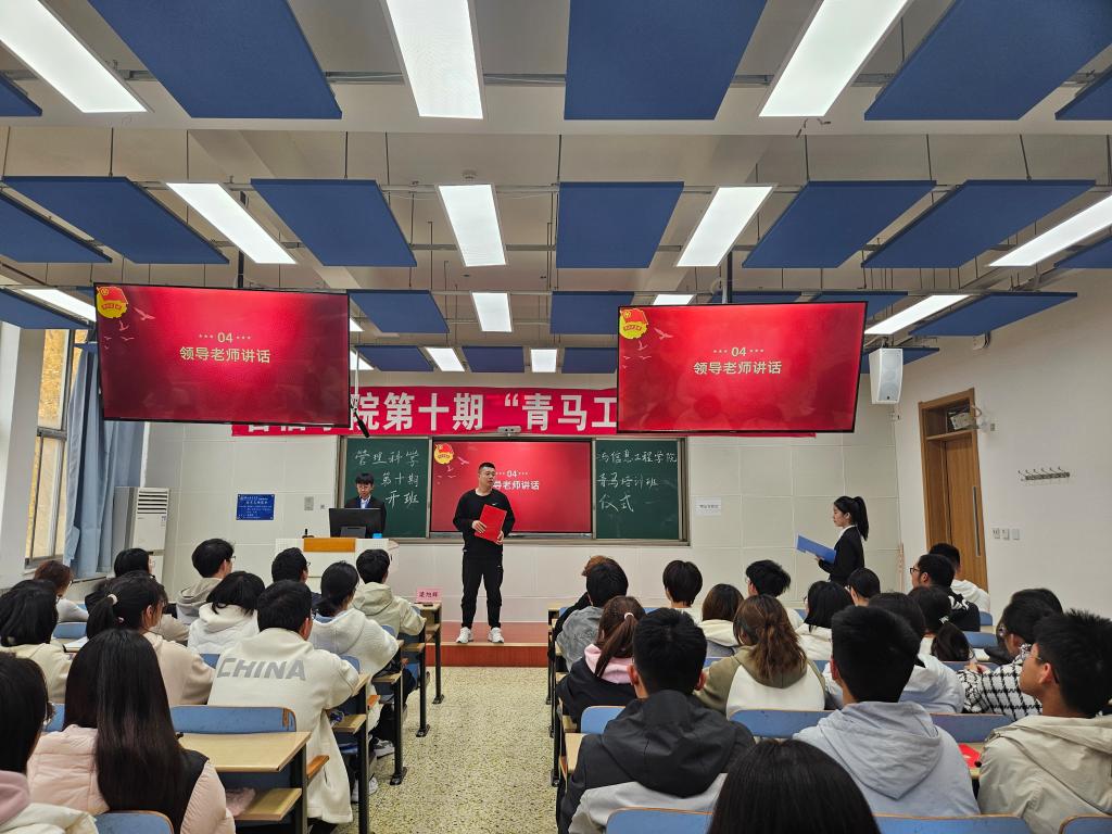 开班仪式全体学员齐唱团歌的昂扬歌声中拉开帷幕。梁旭辉老师为本期青马培训班做开课致辞,他提出三点要求:第一,院团委尊重人才培养规律,深入贯彻党的二十大精神;第二,本期青马培训班要切实做到内容丰富、形式多样;第三:各位同学要勇担时代使命,争做时代新人。他强调,各位学员要刻苦学习理论,积极参加实践,深入领悟并践行习近平总书记的讲话精神,坚持做到知行合一,全面发展。他说,广大青年要不断提高自己的思想政治素质和各方面能力,努力成为中国特色社会主义伟大事业的合格建设者和可靠接班人。