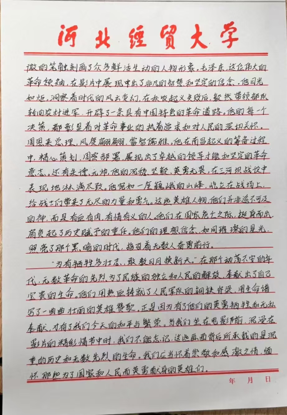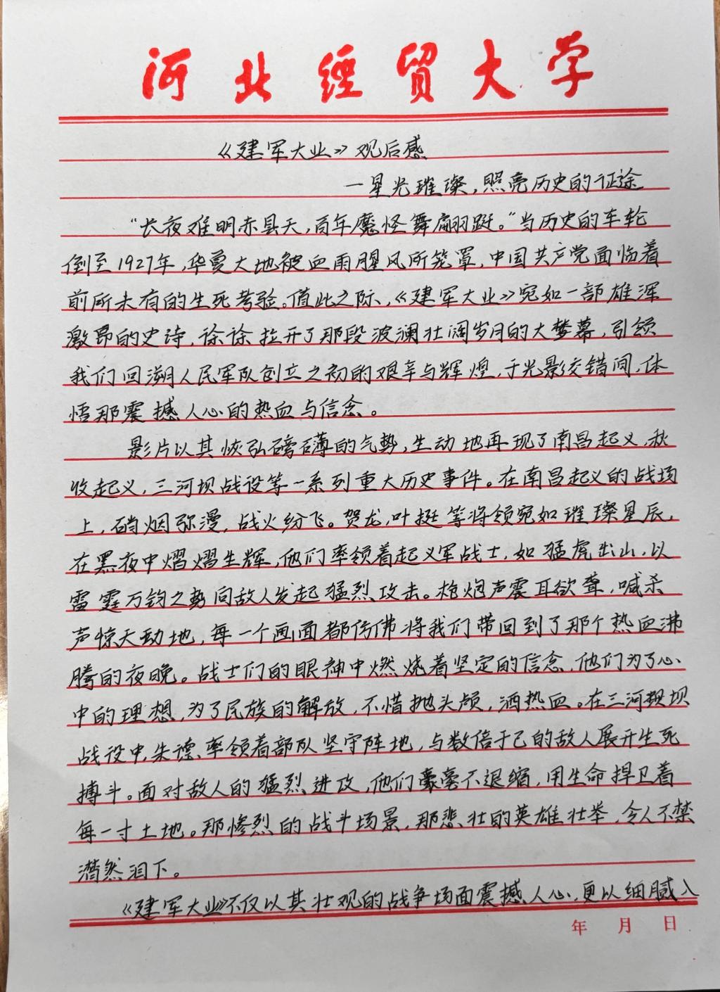 激烈的讨论过后,同学们感受颇深。他们纷纷拿起笔,写下了饱含深情的观后感。那些文字里,有对革命先辈们抛头颅、洒热血的英勇无畏的赞叹;更有对如今来之不易的和平岁月的珍惜。这些观后感就像一扇扇窗,透过它们可以看到同学们被点燃的爱国热情和深深烙印在心中的红色记忆。